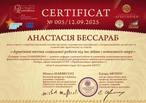 Бессараб А. Короткострокова онлайн-програма підвищення кваліфікації «Архетипні витоки соціальної роботи під час війни і повоєнного миру»; 12.09.2025; 6 академічних годин / 0,2 кредиту ECTS; Centre d’Étude sur l’Actuel et le Quotidien, Українська школа архетипіки (Україна). |