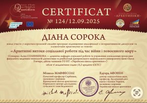 Сорока Д. Короткострокова онлайн-програма підвищення кваліфікації «Архетипні витоки соціальної роботи під час війни і повоєнного миру»; 12.09.2025; 6 академічних годин / 0,2 кредиту ECTS; Centre d’Étude sur l’Actuel et le Quotidien, Українська школа архетипіки (Україна). |
