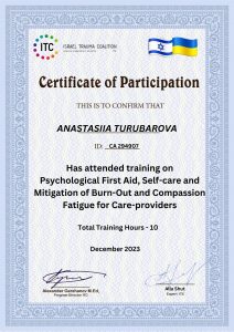 Turubarova A. Psychological First Aid, Self-care and Mitigation of Burn-out and Compassion Fatigue for Care-providers (training); December 2023; 10 academic hours; Israel Trauma Coalition (Israel). |