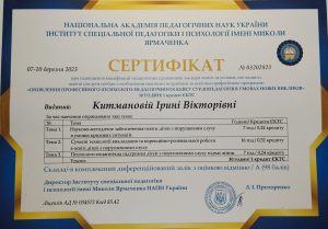 Китманова І.В. Підвищення кваліфікації «Оновлення професійного (психолого-педагогічного) кейсу сурдопедагогів в умовах нових викликів»; 07–10.03.2023; 30 академічних годин / 1 кредит ECTS; Інститут спеціальної педагогіки і психології імені Миколи Ярмаченка НАПН України (Україна). |