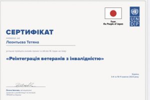 Леонтьєва Т. Онлайн-тренінг «Реінтеграція ветеранів з інвалідністю»; 03–04.10.2023; 16 академічних годин; UNDP, From the People of Japan (Україна, Японія). |