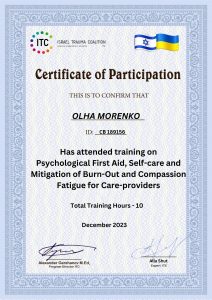 Morenko O. Psychological First Aid, Self-care and Mitigation of Burn-out and Compassion Fatigue for Care-providers (training); December 2023; 10 academic hours; Israel Trauma Coalition (Israel). |