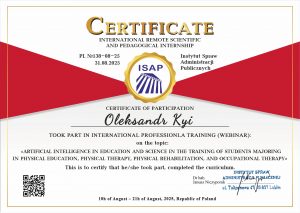 Kyi O. International professional training (webinar) «Artificial Intelligence in Education and Science in the Training of Students Majoring in Physical Education, Physical Therapy, Physical Rehabilitation, and Occupational Therapy»; 10.08.2025 – 21.08.2025; (hours not specified) / (credits not specified); Instytut Spraw Administracji Publicznych (Poland). |