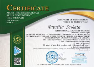 Serhata N. International advanced training (webinar) «Academic Integrity in the Specialists Training of Physical Education and Sport Teachers in the European Union Countries and Ukraine»; 31.10.2022 – 07.11.2022; 45 academic hours / 1.5 ECTS credits; (Poland). |