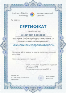 Бессараб А. Курс стажування «Основи психотравматології» (IV модуль «Діти, травма та втрата. Інструменти терапії»); жовтень 2025; 21 академічна година / 0,7 кредиту ECTS; Інститут психології здоров’я (Україна). |