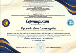 Кириллова А.О. Всеукраїнська науково-практична конференція «Становлення особистості в умовах сучасного розвитку суспільства: психолого-педагогічний, корекційно-реабілітаційний, соціальний і медичний аспекти»; 01–02.05.2025; 16 академічних годин / 0,5 кредиту ECTS; Полтавський національний педагогічний університет імені В. Г. Короленка (Україна). |