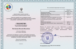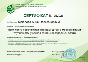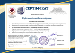 Кириллова А.О. Підвищення кваліфікації «Сучасні методи мовленнєвої корекції дітей»; 11.04.2025; ГО «Територія розвитку» (Україна). |
