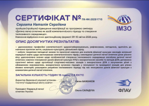 Сергата Н.С. Семінар «Дитяча легка атлетика як засіб компетентнісного підходу та створення інклюзивного середовища»; 09–10.04.2025; 15 академічних годин / 0,5 кредиту ECTS; Інститут модернізації змісту освіти, Федерація легкої атлетики України (Україна). |