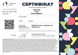 Кириллова А.О. Спеціалізоване навчання «Перший контакт з людиною, яка втратила зір»; 25.03.2025; Академія НСЗУ, Міністерство охорони здоров’я України (Україна). |