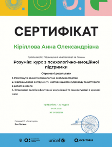 Кириллова А.О. Підвищення кваліфікації «Розумію: курс з психологічно-емоційної підтримки»; 04.01.2025; 30 академічних годин; Освіторія, UNICEF (Україна). |