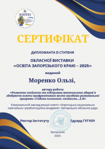 Моренко О. Обласна виставка «Освіта Запорізького краю – 2025» (дипломант ІІ ступеня); 2025; Хортицька національна академія (Україна). |