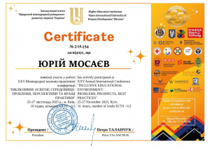 Mosaiev Y. XXV Annual International Conference «Inclusive Educational Environment: Problems, Prospects, Best Practices»; 25–27.11.2025; 16 academic hours / 0.5 ECTS credits; Open International University of Human Development “Ukraine” (Ukraine). |