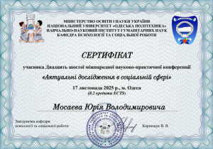 Мосаєв Ю.В. Міжнародна науково-практична конференція «Актуальні дослідження в соціальній сфері»; 17.11.2025; 0,2 кредиту ECTS; Національний університет «Одеська політехніка» (Україна). |