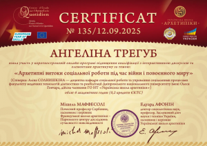Трегуб А. Короткострокова онлайн-програма підвищення кваліфікації «Архетипні витоки соціальної роботи під час війни і повоєнного миру»; 12.09.2025; 6 академічних годин / 0,2 кредиту ECTS; Centre d’Étude sur l’Actuel et le Quotidien, Українська школа архетипіки (Україна). |