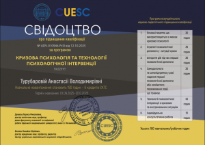 Турубарова А.В. Програма підвищення кваліфікації «Кризова психологія та технології психологічної інтервенції»; 01.09.2025 – 12.10.2025; 180 академічних годин / 6 кредитів ECTS; CUESC (Україна). |