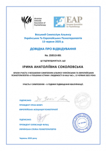 Соколовська І.А. Симпозіум «Восьмий симпозіум Альянсу Українських та Європейських психотерапевтів»; 13.06.2025; 6 академічних годин; Ukrainian Umbrella Association of Psychotherapy, European Association for Psychotherapy (Україна). |