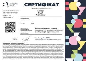 Коляда Н.А. Спеціалізоване навчання «Моніторинг і ведення випадків сексуального та домашнього насилля у практиці лікарів первинної ланки»; 17.07.2025; 10 академічних годин; Академія НСЗУ, Міністерство охорони здоров’я України (Україна). |