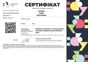 Коляда Н.А. Спеціалізоване навчання «Лікування пацієнтів із легкою черепно-мозковою травмою від дії вибухової хвилі»; 14.07.2025; 10 академічних годин; Академія НСЗУ, Міністерство охорони здоров’я України (Україна). |