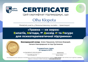Klopota O. Online practicum «Trauma is not a sentence: Empathy, Methods, Experience and Resource for psychotherapeutic support»; 26.05.2025; 3 academic hours / 0.1 ECTS credits; UpPro School (Ukraine). |