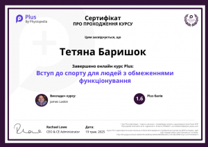 Баришок Т. Онлайн-курс «Вступ до спорту для людей з обмеженнями функціонування»; 19.05.2025; Physiopedia (Україна). |