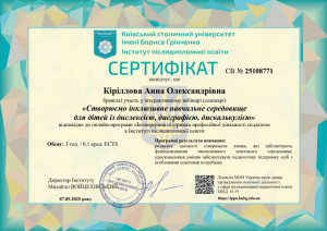 Кириллова А.О. Інтерактивний вебінар «Створюємо інклюзивне навчальне середовище для дітей із дислексією, дисграфією, дискалькулією»; 07.05.2025; 3 академічні години / 0,1 кредиту ECTS; Київський столичний університет імені Бориса Грінченка (Україна). |