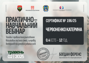 Червоненко К. Практично-навчальний вебінар «Техніки і правила консультування військових та їхніх сімей, супровід ветеранів та демобілізованих осіб»; 02.05.2025; 12 академічних годин / 0,4 кредиту ECTS; ГО «Прогресильні» (Україна). |