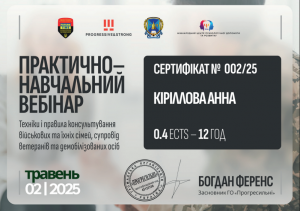 Кириллова А.О. Практично-навчальний вебінар «Техніки і правила консультування військових та їхніх сімей, супровід ветеранів та демобілізованих осіб»; 02.05.2025; 12 академічних годин / 0,4 кредиту ECTS; ГО «Прогресильні» (Україна). |