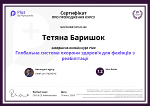Баришок Т. Онлайн-курс «Глобальна система охорони здоров’я для фахівців з реабілітації»; 18.07.2024; Physiopedia, ReLAB-HS (Україна). |