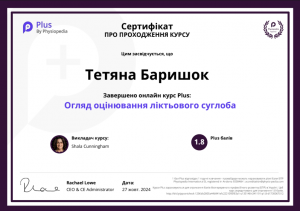 Баришок Т. Онлайн-курс «Огляд оцінювання ліктьового суглоба»; 27.10.2024; Physiopedia (Україна). |