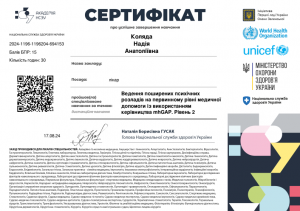 Коляда Н.А. Спеціалізоване навчання «Ведення поширених психічних розладів на первинному рівні медичної допомоги із використанням керівництва mhGAP»; 14.08.2024; 30 академічних годин / 1 кредит; Академія НСЗУ, Міністерство охорони здоров’я України, World Health Organization (Україна). |