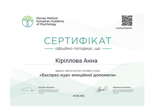 Кириллова А.О. Онлайн-курс «Експрес-курс емоційної допомоги»; 20.06.2024; Murray Method European Academy of Psychology (Україна). |