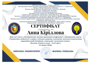 Кириллова А.О. Всеукраїнська науково-практична конференція «Становлення особистості в умовах сучасного розвитку суспільства: психолого-педагогічний, корекційно-реабілітаційний, соціальний і медичний аспекти»; 24.05.2024; 8 академічних годин / 0,3 кредиту ECTS; Полтавський національний педагогічний університет імені В.Г. Короленка (Україна). |