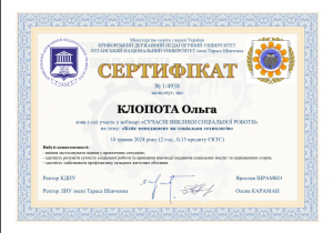 Клопота О. Вебінар «Сучасні виклики соціальної роботи» (кейс менеджмент як соціальна технологія); 14.05.2024; 2 академічні години / 0,15 кредиту ECTS; Криворізький державний педагогічний університет, Луганський національний університет імені Тараса Шевченка (Україна). |