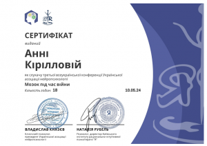 Кириллова А.О. Всеукраїнська конференція «Мозок під час війни»; 10.05.2024; 18 академічних годин; Українська асоціація нейропсихології (Україна). |