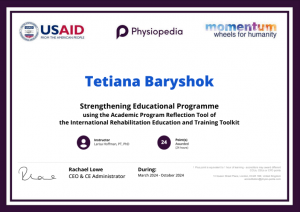 Baryshok T. Strengthening Educational Programme using the Academic Program Reflection Tool of the International Rehabilitation Education and Training Toolkit (online course); March 2024 – October 2024; (hours not specified) / (credits not specified); Physiopedia, USAID, Momentum Wheels for Humanity (Ukraine). |