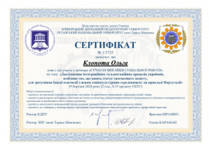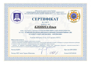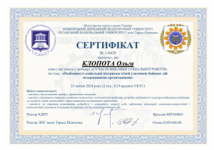 Клопота О. Вебінар «Сучасні виклики соціальної роботи» (соціальна підтримка військовослужбовців та членів їх сімей: нові виклики – нові рішення); 09.04.2024; 2 академічні години / 0,15 кредиту ECTS; Криворізький державний педагогічний університет, Луганський національний університет імені Тараса Шевченка (Україна). |