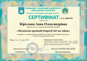 Кириллова А.О. Інтерактивний вебінар «Механізми протидії депресії під час війни»; 27.02.2024; 6 академічних годин / 0,2 кредиту ECTS; Київський столичний університет імені Бориса Грінченка (Україна). |