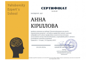 Кириллова А.О. Вебінар «Кінезіотейпування для дітей з порушеннями розвитку»; 03.03.2024; 6 академічних годин / 0,2 кредиту ECTS; Yakubovsky Expert’s School (Україна). |