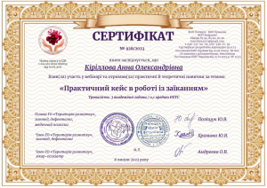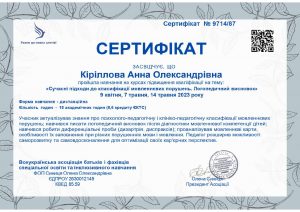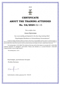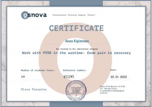 Кіріллова А. Work with PTSD in the wartime: from pain to recovery (educational program); 20.01.2023; 60 academic hours; International Training Company «Osnova» (Ukraine). |