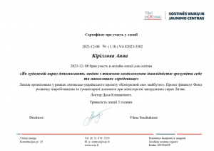 Кириллова А. Участь в онлайн-лекції «Як художні вирази допомагають людям з тяжкою комплексною інвалідністю зрозуміти себе та навколишнє середовище»; 08.12.2023; 3 академічні години; Tikri Mokymai, Sostinės vaikų ir jaunimo centras (Литва). |