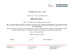 Кириллова А. Участь в онлайн-лекції «Як музичний вираз допомагає людям із комплексною складною інвалідністю зрозуміти себе та своє оточення»; 23.11.2023; 3 академічні години; Tikri Mokymai, Sostinės vaikų ir jaunimo centras (Литва). |