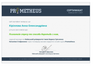 Кириллова А.О. Курс «Психологія стресу та способи боротьби з ним»; 09.11.2023; Prometheus, Київський університет імені Бориса Грінченка (Україна). |