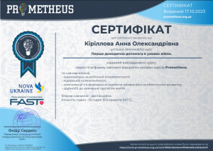 Кириллова А.О. Курс «Перша домедична допомога в умовах війни»; 17.10.2023; 15 академічних годин / 0,5 кредиту ECTS; Prometheus, Nova Ukraine, FAST (Україна). |