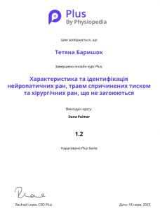 Баришок Т. Онлайн-курс «Характеристика та ідентифікація нейропатичних ран, травм спричинених тиском та хірургічних ран, що не загоюються»; 18.06.2023; Physiopedia (Україна). |