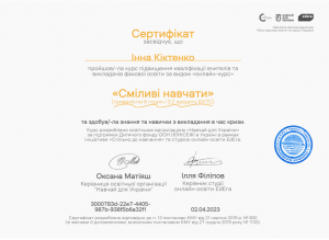 Кіктенко І. Онлайн-курс «Сміливі навчати»; 02.04.2023; 6 академічних годин / 0,2 кредиту ECTS; EdEra, Навчай для України, UNICEF (Україна). |