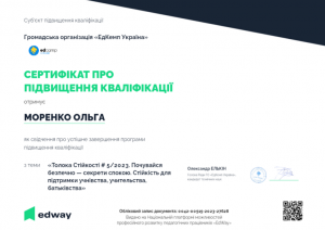 Моренко О. Підвищення кваліфікації «Толока стійкості #5 2023. Подурбайся безпечно – секрети спокою. Стійкість для підтримки учнівства, учительства, батьківства»; 23.02.2023; 2,5 академічні години / 0,08 кредиту ECTS; ГО «ЕдКемп Україна», EdWay (Україна). |