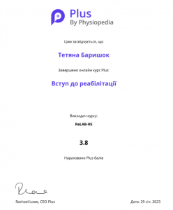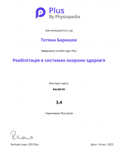 Баришок Т. Онлайн-курс «Вступ до реабілітації»; 29.01.2023; Physiopedia, ReLAB-HS, USAID (Україна). |
