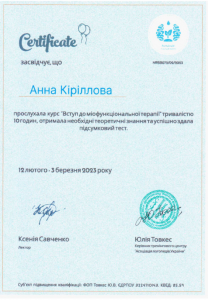 Кириллова А.О. Курс «Вступ до міофункціональної терапії»; 12.02.2023 – 03.03.2023; 10 академічних годин; Асоціація логопедів України (Україна). |
