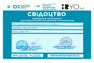 Китманова І. Курс «Перша психологічна допомога під час та після війни»; 26.07.2022; (кількість годин не зазначено) / 1 кредит ECTS; Інститут модернізації змісту освіти, HRYO (Україна). |