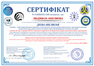 Анісімова Л. Курс «Дієва інклюзія»; 01.11.2022; 30 академічних годин / 1 кредит ECTS; International Institute of Inclusion (Україна). |